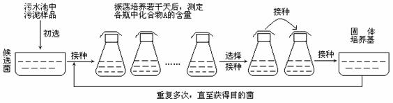 56.(13分)某化工厂的污水池中含有一种有害的难以降解的有机化合物A。研究人员用化合物A、磷酸盐、镁盐以及微量元素配制的培养基,成功筛选到能高效降解化合物A的细菌(目的菌)。实验的主要步骤如下图所示。请分析回答下列问题。