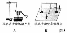 (福州)13.如图7所示,小明用手使劲捏玻璃瓶,细玻璃管内的水面就会上升,通过观察细玻璃管内水柱高度的变化,就能判断玻璃瓶受压后发生了微小形变。这种把微小量放大有利于观察的方法在物理学里称为“微小量放大法”。图8各实验中应用了与此相同实验方法的是
