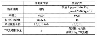 (宜昌) 37.以“低碳世博”为理念的上海世博园区,有很多新能源汽车在示范运行,其中包括120辆纯电动客车,实现了公共交通的零排放。下表是某纯电动汽车与燃油汽车进行测试时的部分数据:请根据上表提供的有关数据计算:(1)电动汽车行驶100km比燃油汽车节约多少费用?(2)燃油汽车每行驶100km向空气排放多少千克的二氧化碳?(3)电动汽车和燃油汽车的能量转换效率分别是多少?