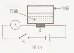 25.(楚雄) (8分)随着社会和科技的发展,小汽车已进入寻常百姓家。如图14所示是一种测量小汽车油箱内油量装置的原理图,它主要由压力传感器R(电阻值随所受压力变化而变化)、油量表A(由电阻可忽略不计的电流表改装而成)、电源等组成电路。压力传感器R在一定范围内的电阻与所受压力的关系如下表所示,油箱位于压力传感器上,压力传感器R的上表面面积为5cm2,电源电压为6v