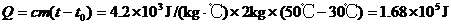 Q=cm⊿t=4.2×103J/(kg·℃)×5kg×(100℃-20℃)=1.68×106J