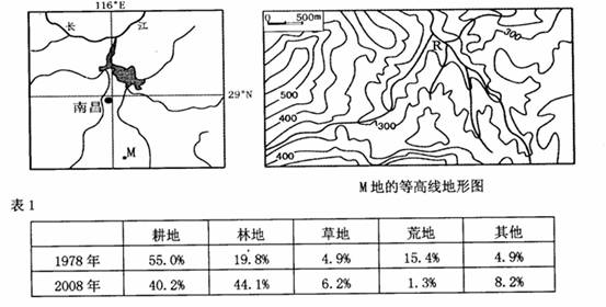 图示意M地的等高线分布,表1示意M地的土地利用结构变化。读图表回答下列问题。