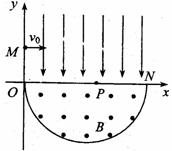 17.(16分)如图,在平面直角坐标系xOy内,第1象限存在沿y轴负方向的匀强电场,第IV象限以ON为直径的半圆形区域内,存在垂直于坐标平面向外的匀强磁场,磁感应强度为B。一质量为m、电荷量为q的带正电的粒子,从y轴正半轴上y=h处的M点,以速度v0垂直于y轴射入电场,经x轴上x=2h处的P点进入磁场,最后以垂直于y轴的方向射出磁场。不计粒子重力。求