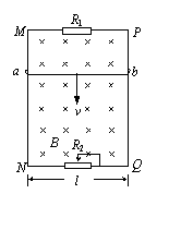 Ω的金属杆ab始终垂直于导轨,并与其保持光滑接触。导轨两端分别接有滑动变阻器R2以及阻值为3.0Ω的定值电阻R1。当杆ab下滑达到稳定状态时,以速率v匀速下滑,此时整个电路消耗的电功率P为0.24W。(g=10m/s2)求: