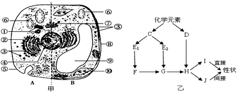 26.(14分)图甲是动植物细胞亚显微结构模式图;图乙表示生物体内某些有机物的组成关系及其功能,其中C、D、E1、E2为小分子化合物,F、G、H、I、J均为高分子化合物。请据图回答: