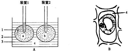 (2)一个成熟的植物细胞可看作一个封闭的渗透系统,因为图B中的_____▲___相当于图A中的2(半透膜),____▲______相当于图A中的a溶液,4处的物质为_______▲___,这种物质能到达4处是因为___________▲________________。