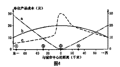 图4为某种工业部门土地、运输和劳动力等成本的曲线图。其中主地成本和运费都只与距离城市中心的远近、交通通达度有关。读图4,回答第7、8题。