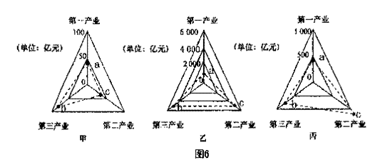 图6中,甲、乙、丙代表三省区2008年国民生产总值及其构成,图中a、b、c分别为三大产业的产值。据图6,回答第10题。