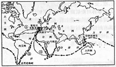 11.下图是《新航路开辟》图,在图中,哥伦布船队的航行路线是 ( )