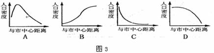 11.下图(图3)中能正确反映上图(图2)Ⅱ阶段城市人口密度与距离市中心的远近两者之间关系的是 ( )