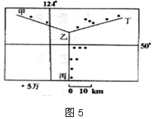 22.下图(图5)为某地区聚落大致分布示意图,若该聚落形态是受河流影响,则图中最有可能是支流的是 ( )