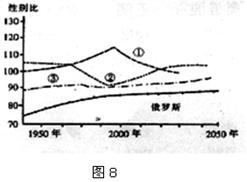 27.(8分)性别结构是指一个国家或地区两性人口数量的比例关系。性别比为平均每100名女性所对应的男性人口数。下图为四个地区人口性别比例曲线图,读下图(图8)回答下列问题。