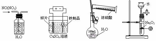 A.除去NO中的NO2 B.铁制品表面镀锌 C.稀释浓硫酸 D.制备少量O2
