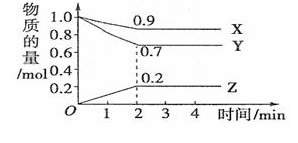 (4分)某温度时,在2L容器中X、Y、Z三种物质的量随时间的变化曲线如图所示,由图中数据分析,该反应的化学方程式为_________________________;反应开始至2min时Z的平均反应速率为__________________。