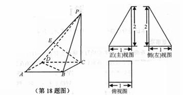 18.(本小题满分14分)已知四棱锥P-ABCD的三视图如下右图所示,其中正(主)视图与侧(左)视为直角三角形,俯视图为正方形。
