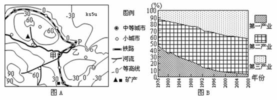 44.图A是“我国东部沿海某地区城市分布图”,图B是“该地区1976年-2008年产业结构变化图”。读图,回答下列问题。 (12分)