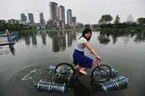 27.(衢州)如图是某同学自制的水上自行车。她在普通自行车上安装8个密闭的空水桶(每个水桶体积为0.02米3),并在车后轮装上若干塑料片。该同学在水面上骑自行车匀速前进时,平均每个水桶约有二分之一体积浸在水 中,不计车轮和塑料片排开水的体积,则此时水上自行车受到的浮力约为 ▲ 牛。