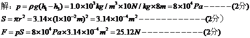 (兰州)31.(6分)如图21所示,水塔与自来水管组成连通器,若水塔内水面高度h1=18m,五楼住户水龙头出水口高度h2=13m,四楼住户水龙头出水口高度h3=10m,水龙头出水口直径为2cm。求: