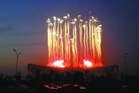 29.(12分)夜幕降临,北京奥运会主会场“鸟巢”内灯火辉煌,鼓瑟齐鸣。璀璨的烟花在空中组成奥运五环等图案,与场内表演相呼应。鸟巢夜景照明由五个部分组成,其中主体照明以传统文化元素“中国红”为主色。下图是北京鸟巢试放烟火奥运五环图,并回答下列问题: