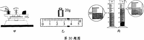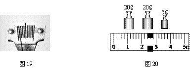 (2)用调节好的天平测石块的质量,若天平平衡时右盘砝码的质量、游码在标尺上的位置如图20所示,则石块的质量 g,若量杯测出石块的体积为15.8cm3,则石块的密度是 g/cm3。