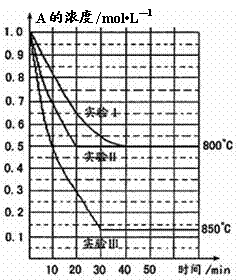 B(g)+ C(g),在三种不同条件下进行,其中实验Ⅰ、Ⅱ都在800℃,实验Ⅲ在850℃,B、C的起始量都为0,反应物A的浓度(mol·L-1)随时间(min)的变化如图所示: