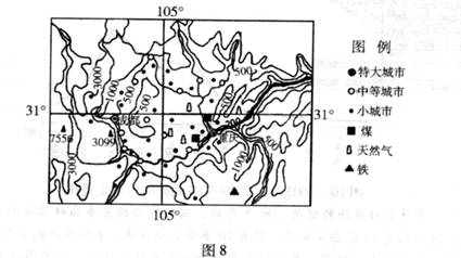 (2) 简述图中中等城市的分布特点,并写出长江对重庆形成和发展的作用。(10分)