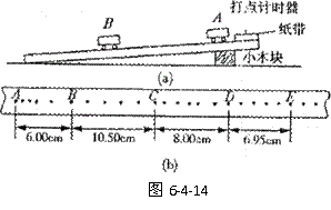 1.某同学设计了一个打点计时器验证动量守恒定律的实验.在小车A的前端和小车B的后端贴有粘扣,在木板的右端固定打点计时器,小车A后连一长纸带,木板下垫有小木块,用来平衡摩擦力.反复移动小木块位置,直到小车的木板上向下运动时可以保持匀速直线运动状态.现使小车A、B分别静止在木板的右端和中间,如图6-4-14中(a)所示,给小车A一个瞬时冲量,使小车A与静止的小车B相碰粘合成一体,并继续作匀速直线运动.已知打点计时器电源频率为50Hz,若得到一条打点纸带且计数点之间的间隔如图6-4-14中(b)所示,A点为运动起点,则应选 段来计算小车A碰撞前的速度,应选 段来计算两车碰撞后的速度.若测得小车A的质量mA=0.4㎏,小车B的质量mB=0.2㎏,由以上数据可得小车A、B碰撞前的总动量为 ㎏·m/s;碰撞后的总动量为 ㎏·m/s;得到的结论是 .(计算结果保留三位有效数字)