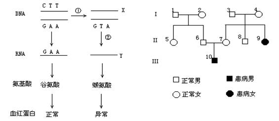 52.(10分)下列左图表示人类镰刀型细胞贫血症的病因,右图是一个家族中该病的遗传系谱图(控制基因为B与b),请据图回答(谷氨酸的密码子是GAA,GAG):![]()