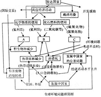 39.(60分)全球环境问题相互联系和相互制约,使人类面临的各种环境问题构成了一个复杂的环境问题群,下图中A、B、C代表的环境问题在整个环境问题群中占有极其重要的位置,因而被认为是三大全球性环境问题。读图回答下列问题。