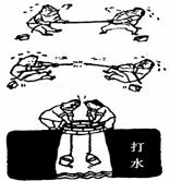 为漫画《打水》写一段文字。要求:①概括说明画面的主要内容;②点明漫画寓意;③语言简明,字数70字以内。