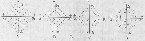 22:理论研究表明,无限大的均匀带电平面在周围空间会形成与平面垂直的匀强电场.现有两块无限大的均匀绝缘带电平面,一块两面带正电,一块两面带负电.把它们垂直放置,如图甲所示,两板单位面积所带电荷量相等(设电荷在相互作用时不移动),图甲中直线A1B1 和A2B2分别为带正电平面和负电平面垂直的交线,O为两交线的交点,则乙图能正确反映等势面分布情况的是( )