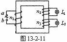 1.如图13-2-11所示,理想变压器原、副线圈匝数比为n1∶n2∶n3 = 4∶3∶2,副线圈上分别接标有“6V,12W”、“12V,36W”的灯泡L1和L2,当a、b两端接交变电源后,L1正常发光,则变压器的输入功率为( )