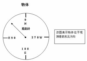 ①利用罗盘判定方向:按“照准(00指向目标)--保持仪器水平--读数”的步骤,正确使用罗盘,读数为00、900、1800、2700表示物体分别位于观测者的北方、东方、南方、西方,其它读数的方位判断以此为基础,如450表示物体位于观测者的东北方向。(如图8)
