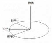 ②利用日影判定方向:在北半球中纬地区,最短的影子指向北方,垂直于地面的杆子的任何两个相等的影子夹角的平分线指示北方;南半球反之。(如图9)