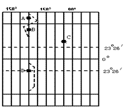 读右图,D地此时是一年中太阳高度最小的正午,此时一艘轮船从A地出发,航行6小时后到达B地,然后又继续航行10天,到达目的地C地(32°N)。回答3-4题。