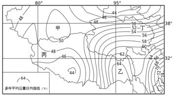 C.乙地多年平均相对湿度小于丙地 D.丙地云量空间变化大于丁地