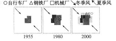 (3)1955年~1980年期间,该市未做过城市规划,2000年,该市进行了城市规划,把自行车、钢铁厂、机械厂放在了同一区域内,它们的位置明显位于市区边缘,分析自身的有利条件是 。同时,对于城市中心区的有利之处是 。