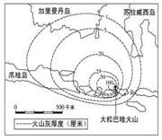 右图表示1816年印度尼西亚大松巴哇火山爆发后火山灰厚度的分布 。读图回答9-10题。