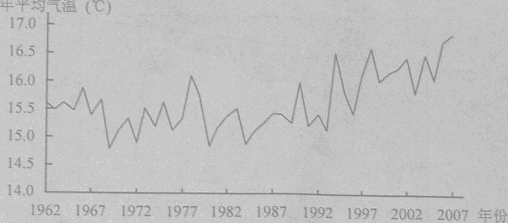 《安徽省应对气候变化方案》提出,安徽省应对气候变化面临巨大挑战,必须加快推进产业结构优化升级,转变经济发展方式。下图表示1962年~2007年安徽省年平均气温变化。完成39-40题。