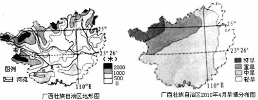 广西于2009年8月至2010年4月发生了旱灾。旱情分布见图乙。