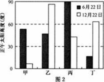 下图为6月22日与l2月22日地球表面四地正午太阳高度。读图回答12-13题。