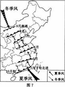 中国2010年上海世界博览会于5月1日正式开园.会期l84天。图7为我国末部地区一般年份夏季风进退及锋面位1示意图。回答14一15题。