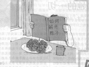 In the cartoon, a man is sitting at a table on which there is a plate full of Zongzi, a kind of Chinese traditional food for the Dragon Boat Festival, and a cup. Somehow it seems that he is at a loss to eat them. Believe it or not, he just finds a book on How to unwrap Zongzi and carefully reads it instead of trying himself.