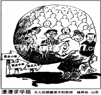We call see in the picture a child is burdened with heavy schoolbags as well as huge mental pressure.When he was young.he was expected to be able to go to a key elementary school,and later a key high school.And now he is expected to be admitted to a key university.Under such distress and difficulties,how can he seek dynamic and active self-development?