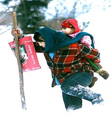图片说明: 雪深没膝,归途迢迢。 勇敢的母亲面前没路,乐观的母亲心里只有微笑。