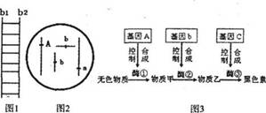 21.图1表示某生物的基因b转录过程中的局部分子状态,图2表示该生物体细胞内基因和染色体之间关系,该生物的黑色素产生需要如图3所示的三种基因共同参与控制,根据题意分析,下列说法不正确的是 ( )