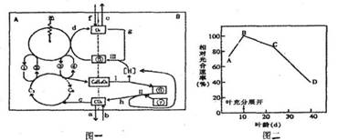 27.(7分)图一表示高等植物叶肉细胞内的A、B两项生理过程及其关系图解,①-⑦代表物质,a-h表示生理过程,Ⅰ-Ⅲ代表B生理过程中的各个阶段。图二表示鸭茅(一种绿色植物,幼叶成蜷曲状)相对光合速率(%)与叶龄的关系。请据图分析回答:
