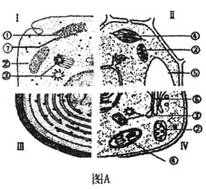 (7分)下图A的四个部分(1一Ⅳ)是四种类型细胞的部分亚显微结构模式图,请据图回答: