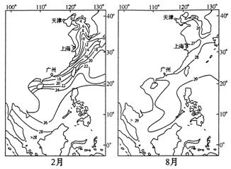 读中国近海2月和8月表层水温分布图,回答21-23题。