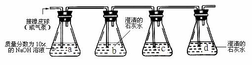 ①取锥形瓶等连接成如上图所示的装置四套,依次编号为甲、乙、丙、丁。其中每套装置的a锥形瓶加入质量分数为10%的NaOH溶液10mL,c锥形瓶加入质量分数5%的葡萄糖溶液10ml,b与d锥形瓶各加入等量的澄清石灰水。